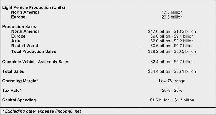 In addition to our 2015 sales and light vehicle production outlook above, we expect 2017 total production sales to be approximately $5 billion higher than 2015, based on assumed full year 2017 light vehicle production volumes of approximately 18.2 million units in North America and approximately 21.9 million units in Europe. We expect the increase in total production sales to be split approximately as follows by segment: 45% in North America, 35% in Europe and 20% in Asia.