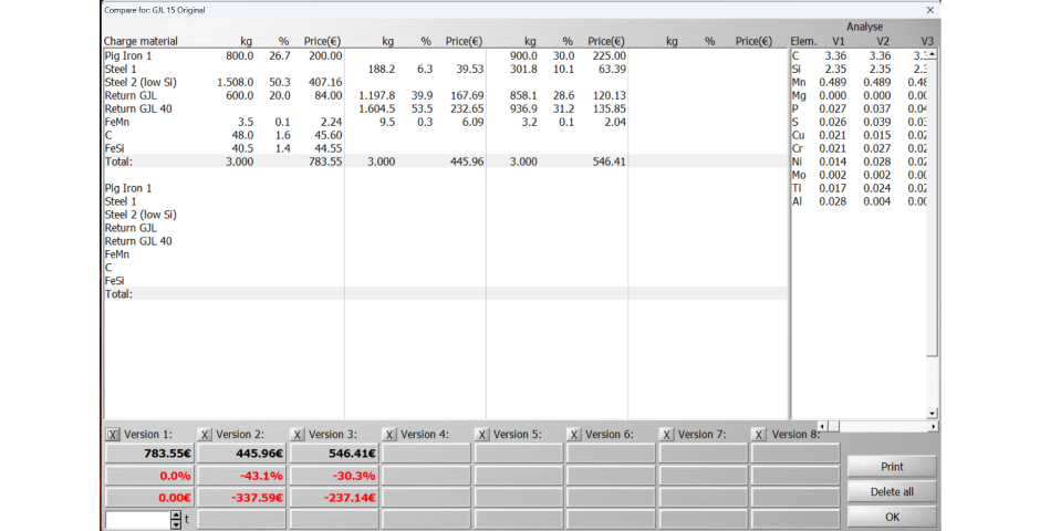 Cost-optimized charge calculation based on target analyses, melting losses, and alloy specifications