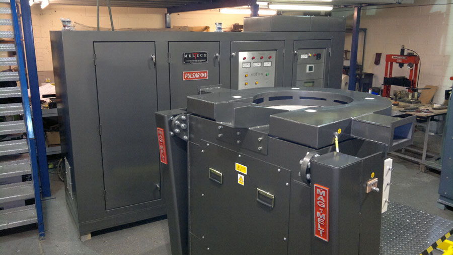 Induction furnace system, Meltech Pulsar 550kW 600Hz inverter installed onto existing 500kg and 1,000kg tilting furnace bodies at Siddons Alloy castings in the UK, system incorporates the latest technology to give improved melt rate and high efficiency while being simple to use and maintain.