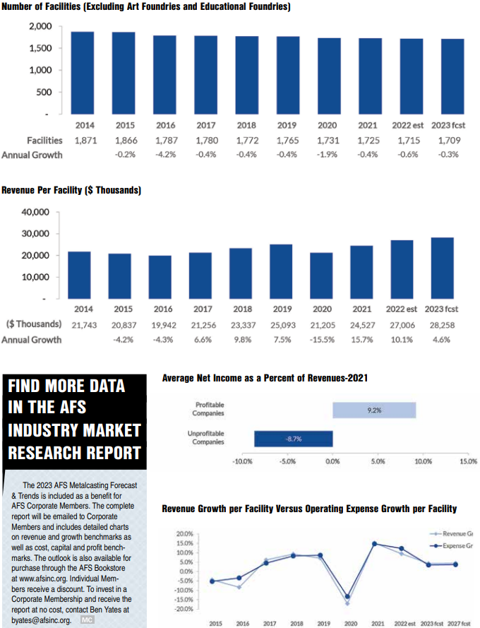 AFS forecasts another year of growth in 2023, albeit somewhat tempered from the pandemic recovery years of 2021 and 2022. Overall estimated revenue for 2023 is $48.3 billion, according to the 2023 AFS Metalcasting Forecast & Trends. This is a 4.3% increase over 2022. In 2022, operating expenses were 82.8% of revenue for foundries, with total operating expenses growing 12.1% year over year.