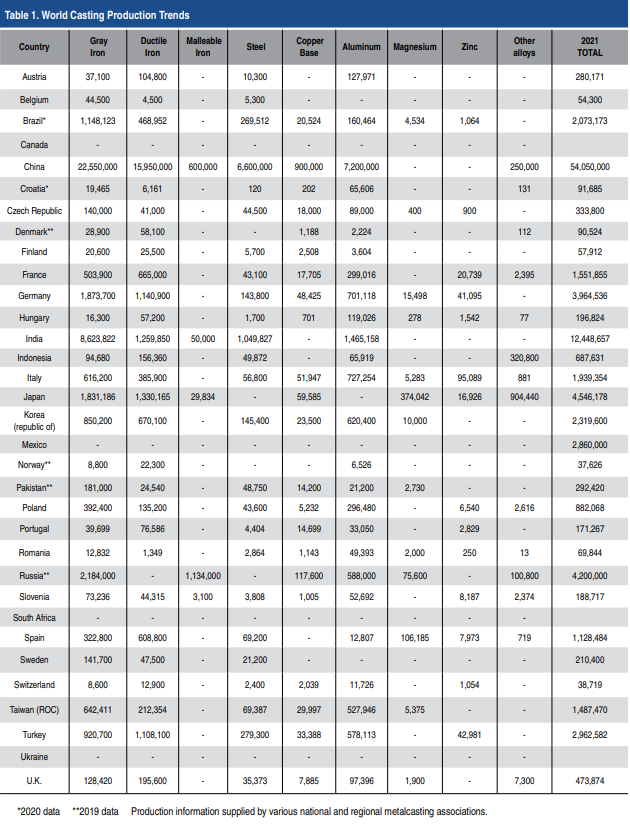 Foundry operating expenses break down as follows: 51.5% for cost of materials, 32.8% employee expenses, 7.3% buildings and expenses and 8.9% other expenses. According to the report, an estimated 89% of foundries are profitable, with an average net income of 9.2% of revenues. The number of U.S. facilities (excluding art and educational foundries) is estimated to be 1,715. Revenue per facility from 2021 to 2022 increased by 10.1% and a 4.6% growth is expected into 2023. Estimated annual revenue per facility is forecast to reach $33.7 million by 2027. More details on the industry outlook are shared in the charts on the following pages, along with a glimpse at a few global casting production trends in Table 1.