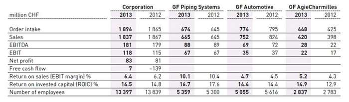 The operating result stood at CHF 35 million, basically at the level of the previous year despite provisions made for cost reduction measures in Europe. In the truck market, a slight upswing is expected in the months to come as EURO 6 norms come into force as of the beginning of 2014. For passenger cars, the present low level of production is probably here to stay for the foreseeable future. Looking forward, major orders have been booked in the first half-year at car and truck manufactures in Europe, thanks to the competitive weight-reduction offering of GF Automotive. They will help increase plant load in the months and years to come.