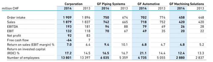 GF Automotive increased its operating result to CHF 49 million against CHF 35 million in 2013. The increase of 40% resulted from a better plant load in Europe as well as from the portfolio streamlining and the cost reductions implemented in 2013.