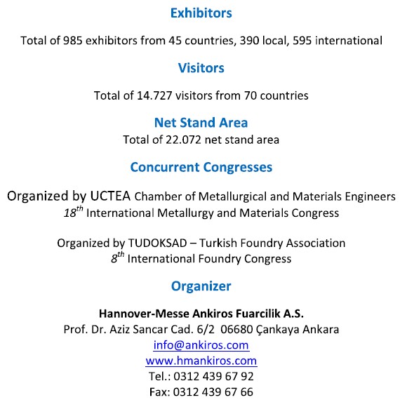 ANKIROS/ANNOFER/TURKCAST 2016 Fairs hosted two congresses in the same venue that addressed the recent scientific and technologic developments in the metallurgy industry. “18 th International Metallurgy and Materials Congress” organized by UCTEA Chamber of Metallurgical and Materials Engineers and “8 th International Foundry Congress” organized by TUDOKSADTurkish Foundry Association These congresses offered an opportunity to discuss new products and studies, latest research results and challenges of the metallurgy industry.