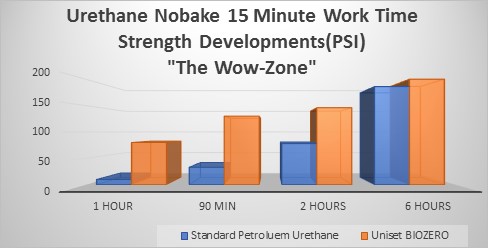 The graph comparison below is a typical strength comparison between the newly developed biosolvent containing urethane system and a standard petroleum solvent system. The comparison of the two systems was done on new round grain silica sand with 1.0% binder having the same work time, and measuring the strength growth there-after. The significant strength increase observed for the biosolvent urethane system is much more rapid and explains all the positive comments provided during the many field trials, which has come to be known as the “Wow-Zone”. Molds made with this new system are ready to be poured in an unusually short period of time.