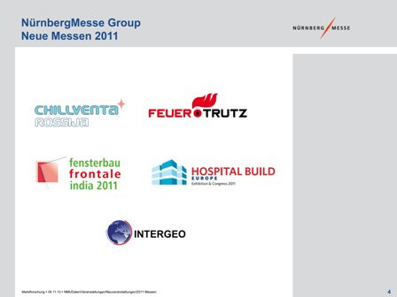 Diederichs expects more growth of the exhibitions in the global portfolio in the coming financial year 2011. "We start with momentum," says Diederichs with an eye on the good registration levels. The NürnbergMesse Group will organize altogether 30 international exhibitions in the coming year, of which two-thirds are outside Nürnberg. The BRIC countries Brazil, Russia, India and China are the most strongly represented with 18 exhibitions. The contracts from federal and state governments for organizing industry pavilions at international exhibitions are also at a high level, and Diederichs expects 35 to 40 contracts.