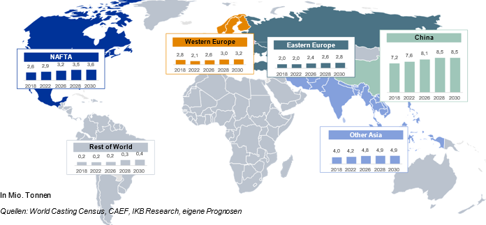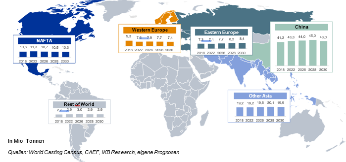In 2020, the COVID-19 pandemic caused a sharp decline in iron casting production, and by 2022 only a few regions had returned to 2018 levels. China was able to expand its dominant position in the short term but will be burdened by lower demand from the construction sector in the long term. Japan and Korea will also lose market share. The rest of Asia will develop on average, like the rest of the world. India, which has a high demand for infrastructure investments, is experiencing stronger growth; Vietnam and Indonesia will follow in the coming years. Within Europe, stronger growth is expected in Eastern European countries, including Turkey, which is still burdened by Russia's war in Ukraine. Spain could benefit in the medium term from the wind energy boom.