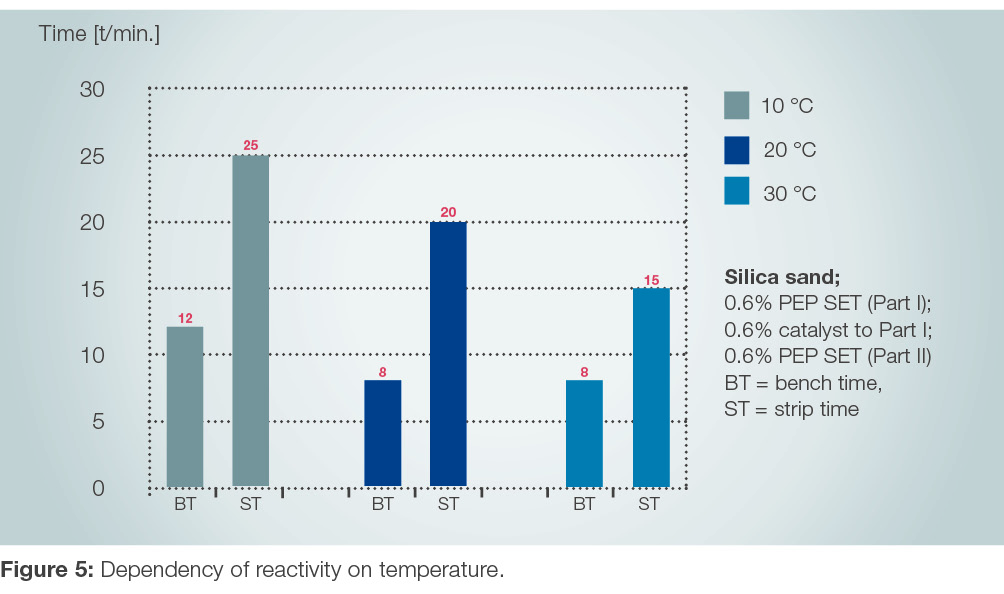 The curing speed is only negligibly dependent on the ambient temperature and/or sand temperature (Figure 5) and can be controlled, almost as preferred, with the quantity and/or quality of catalyst (catalyst amount specific to Part 1: 0.5 - 5.0%).