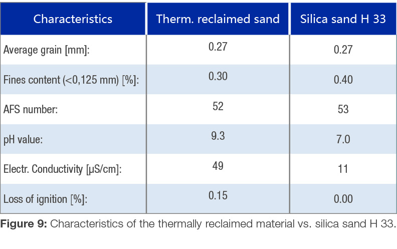 The sand strengths also attain high values with the thermally reclaimed material. Despite the sometimes complex geometries, it is possible with the new system to work with a minimum binder and catalyst amounts. The thermal reclamation of the used sand proceeds in a very stable way (Figure 9) and facilitates both resource-efficient and cost-saving work.