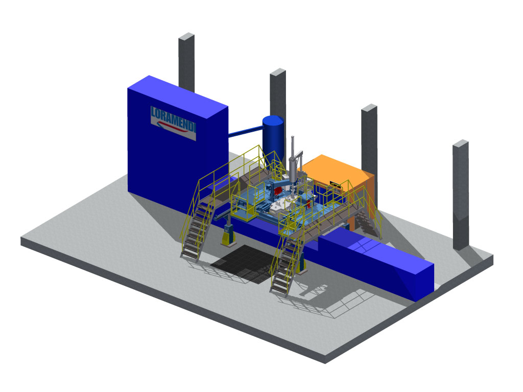 The pouring system is serving a Loramendi vertical molding line, which is equipped with a flexible chamber size. In order to have the same pouring conditions, even when the mold height is changing, the pouring system comes with hydraulic legs to lift the entire pouring assembly in the Z direction.