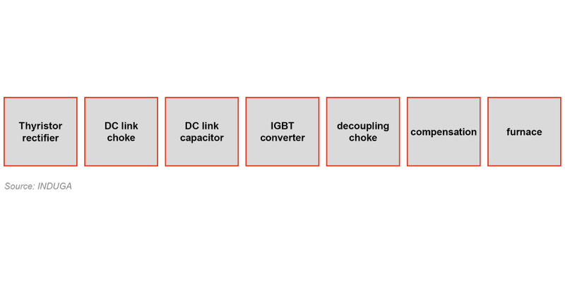 Depending on the application, the furnace vessel can have the shape of a trough, a drum or a cylinder. Pressurized multi-chamber furnaces can also be designed that way. The primary winding is connected to a power supply which provides a suitable voltage (in practice, usually between 180 and 690 V) and compensates the inductive reactive power of the inductor.