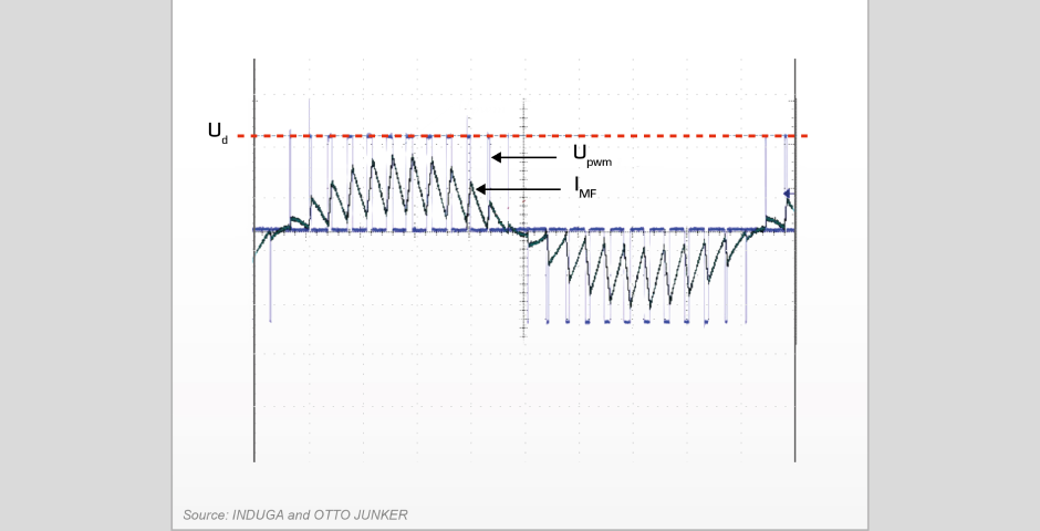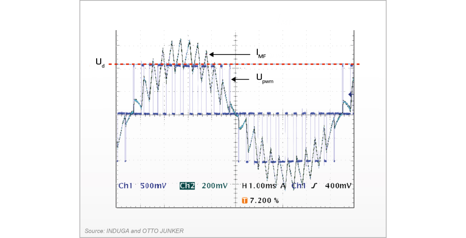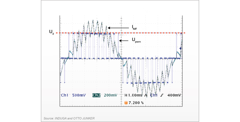 An inverter consists of two inverter half bridges. An IGBT module as used by Otto Junker corresponds to an inverter half bridge and is pre-assembled on a water-cooled cooling plate. That way, the IGBT module can be indirectly water-cooled. This is one of the advantages of the system since it makes a separate water cooling with high demands on the water quality redundant. The IGBT module has an integrated control and monitoring electronics system.