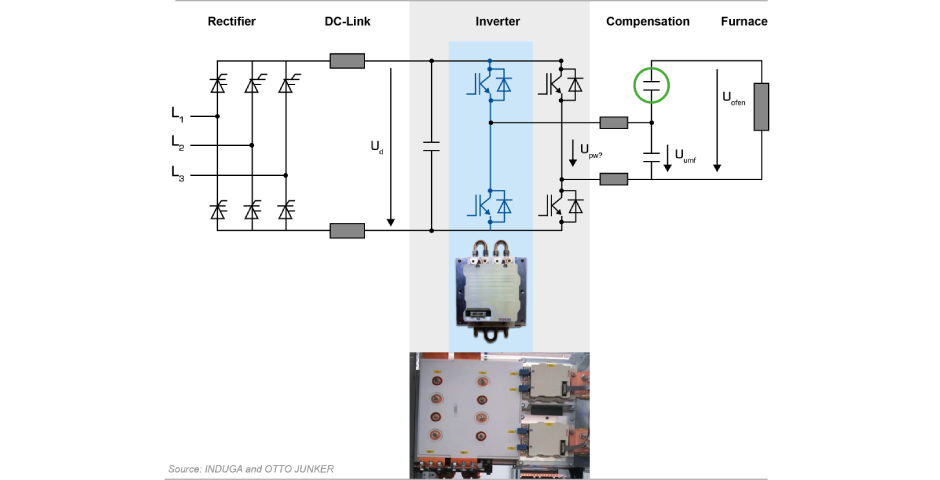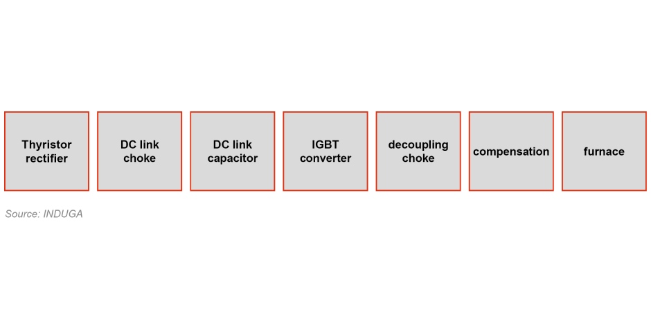 The current d.c. link circuit converters (inverter with thyristors) and voltage d.c. link circuit converters (inverter with IGBT) offered by Otto Junker use parallel compensation. With this arrangement, only the real current is provided by the converter while the reactive current part of the furnace current is provided by the capacitors.