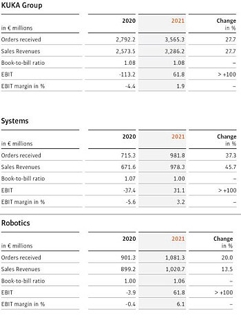 - KUKA exceeds revenue and earnings targets issued in 2021 and has a positive out-look for the current fiscal year.