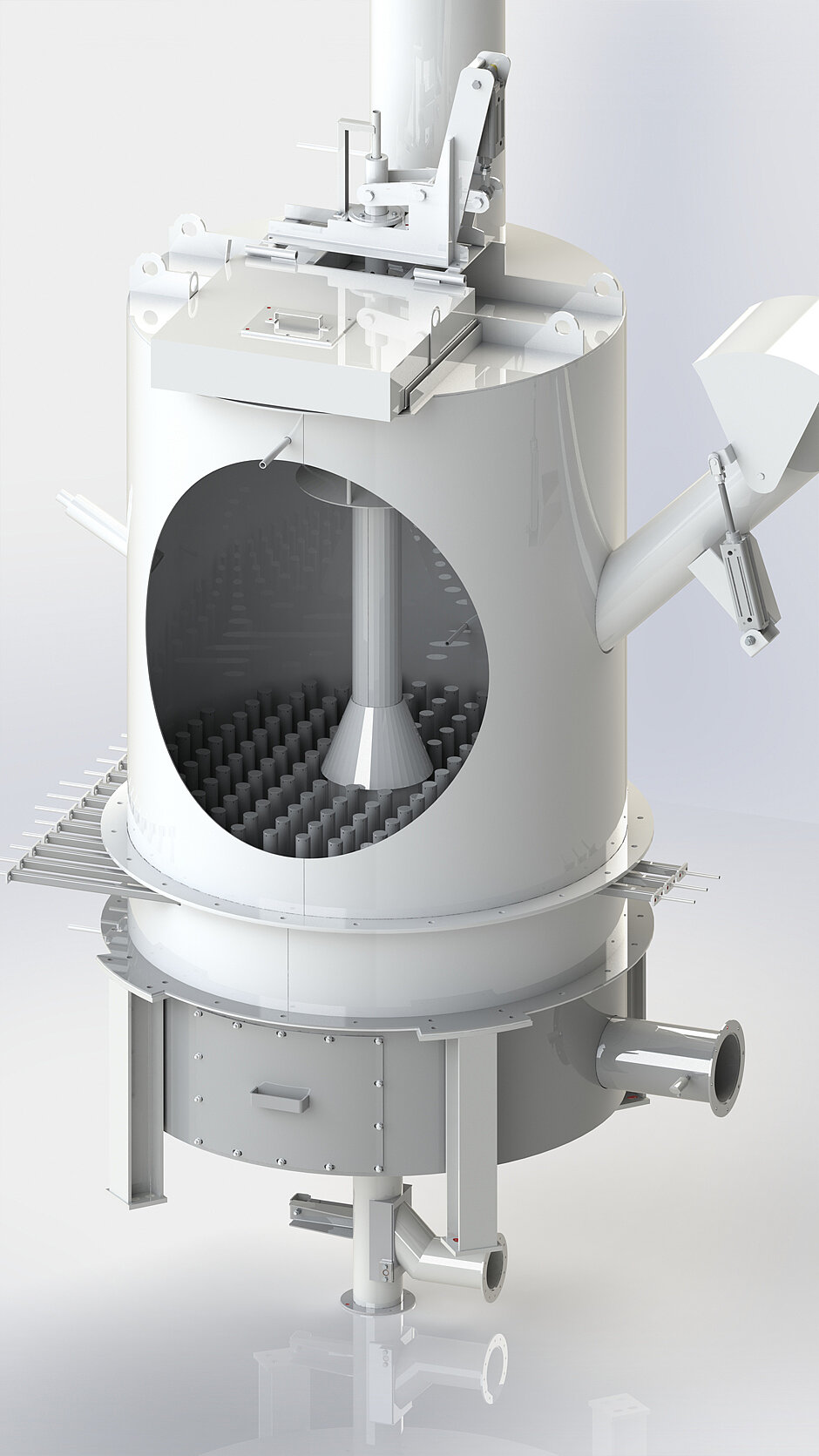In the second stage, the sand is fed to the thermal stage. Gas and air mix in a sand bed, it fluidises, and the organic binder and fines are burnt. The effect of the quartz cracking loosens any remaining binder from the natural recesses of a grain of sand or even blasts it off. In the third, also mechanical stage, the last residues are rubbed off the grain; it works in the same way as stage one.