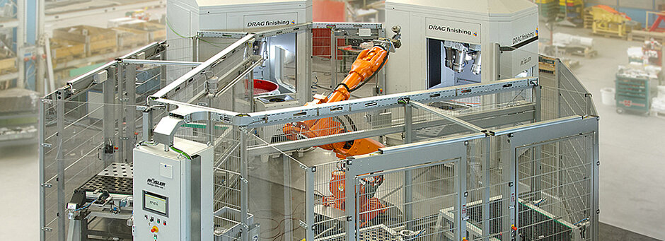 For the deburring process itself batches of tool bodies are staged at the drag finishers in customer specific work piece carriers with push carts. A challenge was the precise positioning of the work pieces with a tolerance of 1/10 mm required for robotic handling. This was resolved by the joint development of a special loading concept incorporating the modeling of enveloping surfaces and establishment of load patterns.