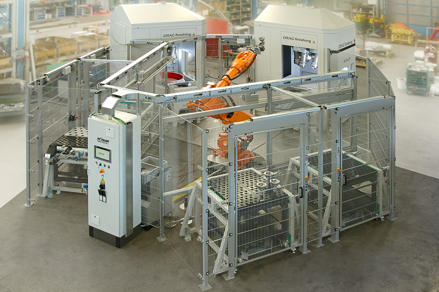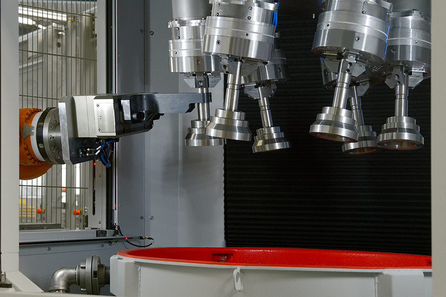 The robot work area, shielded by a protective fence with access doors, provides space for four (4) push carts. Once the carts are placed in their pre-defined position, the operator keys the respective enveloping surface model and the quantity of work pieces into the operating panel. The master control automatically selects the respective work piece program, calculates the number of processing cycles and assigns the work pieces according to the pre-defined loading logic. The precise positioning of the rotating spindles is handled by the drag finisher controls. As soon as the door of the protective fence is closed, the robot starts loading the spindles with the raw tooling bodies.