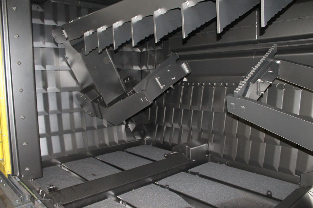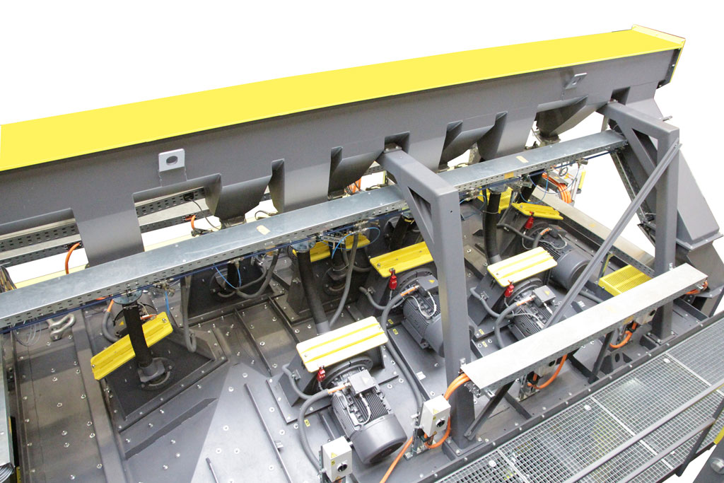 The RMBS installed at Gienanth is equipped with eight high performance blast turbines, type EVO 38, mounted on the roof of the blast chamber, Each of these turbines, with a wheel disk diameter of 40 cm (16 inches) and an installed drive power of 30 kW each, can throw up to 350 kg (770 lbs) of blast media per min. The optimum position of the turbines was determined by computer simulation which ensures that all surface areas of the engine blocks, including the front and rear sections, are evenly exposed to the blast stream. The blast chamber is fabricated from 10 mm (0.4 inch) thick manganese steel and is lined with exchangeable, overlapping 12 mm (0.5 inch) thick manganese steel plates. This, and the fact that the two outside turbines can be turned off for blast cleaning of smaller components, keeps the wear rate in the blast chamber at a minimum. Since all blast turbines are equipped with shell valves, the media flow to the turbines can be adjusted for each individual engine block and shot blasting task: For example, when components must be de-sanded, including core sand removal, the system has not only to cope with the work piece weight of 5,000 kg (11,000 lbs) but also with a sand quantity of about 4,000 kg (9,000 lbs). In this application the process begins with 2 turbines and, depending on the blast program, the other turbines are automatically turned on in a pre-determined sequence. This prevents a sudden sand surge and helps to “peel” off the sand in small layers ensuring that the integrated magnetic separator can remove the sand from the blast media to the specified cleanliness – residual sand content in the blast media < 0.20% - without being oversized for blast applications with less or no sand.