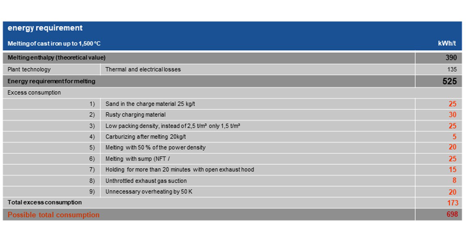 To illustrate this, the table shows energy values for a furnace with a capacity of 8,000 kg of cast iron, operated at a maximum power of 7,000 kW.