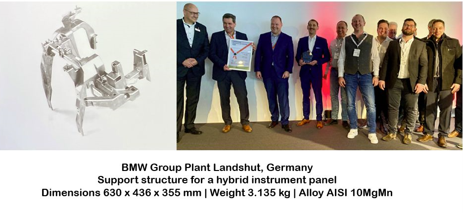 Honoured was a highly aluminium structural casting (dimensions: 630 x 436 x 355; weight: 3.135 kg, alloy aisi 10MgMn) with a thickness of just 1.5 mm. The special feature is the production using 4-plate technology, with considerable advantages in terms of flow paths and sprue. This means that the sprue areas can be produced in highly quality. In addition, the aluminium lightweight construction has been able to reduce the CO2 footprint by percent by replacing magnesium with aluminium.