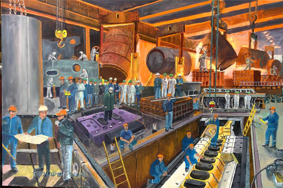 He wanted a painting to include people, some molding, core setting and cleaning. This painting depicts pouring a record breaking 320 net ton ductile press frame with five 70-ton ladles and also depicts one of those anniversaries where men and women assemble for a group photo. Strange that adding the people has created an intense reminder that it is the German people that have made the success, even though we get a glimpse of one record weight casting.