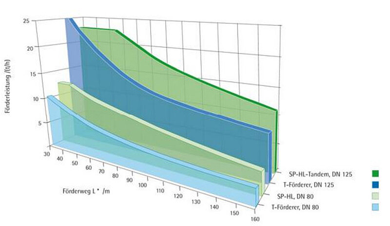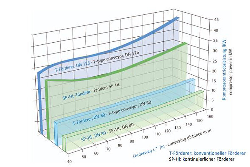 Figure 2 impressively shows the energy savings thanks to the continuous conveying with an SP-HL. Particularly for long conveying distances, energy savings of up to 50 % are achieved (energy consumption of a conventional T-conveyor in relation to the energy consumption of an SP-HL conveyor).