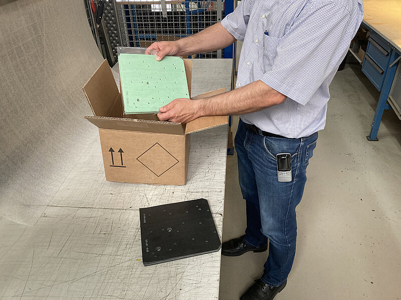 The production data record is digitally transmitted to the waterjet cutting machine. Here, the production process starts based on Membrit and Frenzelit in stock and then the membrane/flat gasket is marked for dispatch.