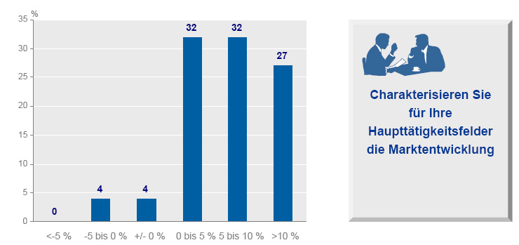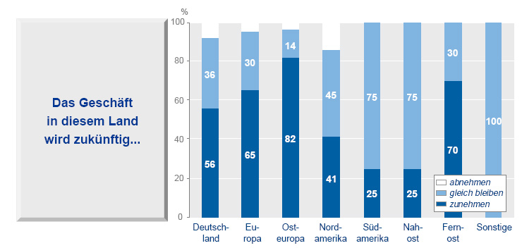 Die Mehrzahl der befragten Unternehmen erwartet zukünftig stark zunehmende Geschäfte vor allem mit Osteuropa und Fernost. Das Wachstum in Markt EU wird stärker als in Deutschland eingeschätzt.