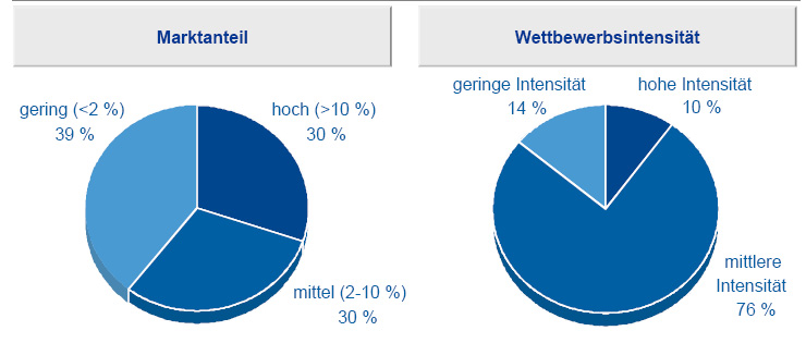 Die Branche ist mittelständisch geprägt. Segmente sind erkennbar: 30% der befragten Unternehmen spielen mit einem Marktanteil von über 10% in ihrem Segment eine bedeutende Rolle.Die Wettbewerbsintensität ist verhalten. Jeder zehnte Befragte sieht sich in einem ruinösen Wettbewerb. Jedes siebte Unternehmen hat eine Nische geringer Wettbewerbsintensität gefunden.