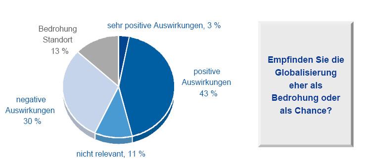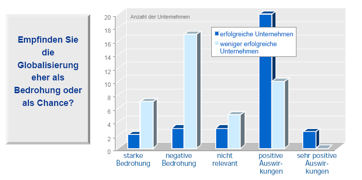 Während mehr als drei Viertel aller erfolgreichen Unternehmen die Globalisierung als Chance begreifen, sehen knapp zwei Drittel der weniger erfolgreichen Unternehmen in der Globalisierung eine Bedrohung oder starke Bedrohung. Sie fühlen sich dem internationalen Wettbewerb nicht gewachsen. <break></break>