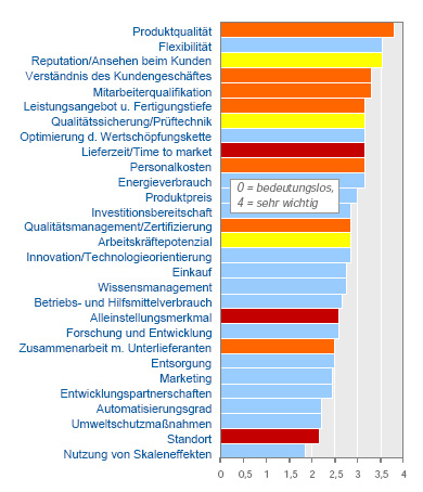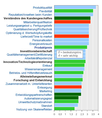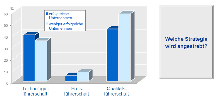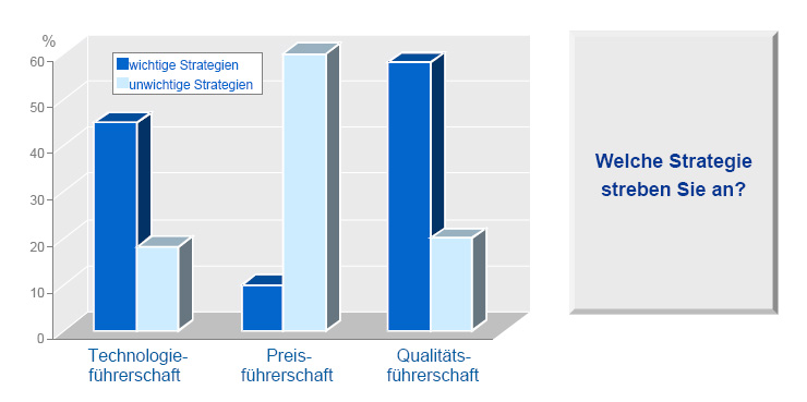 Die meisten befragten Unternehmen geben an, sich durch Qualität vom Wettbewerb abheben zu wollen. Etwa 40 % der Unternehmen geben an, sich durch Technologie vom Wettbewerb abheben zu wollen. Preisführerschaft ist eindeutig die unwichtigste Strategie.