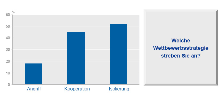 In Bezug auf die Wettbewerber bevorzugen die Befragten etwa in gleichen Teilen die Strategie der Kooperation (Zusammenarbeit mit Wettbewerbern) und der Isolierung (Abgrenzung von der Konkurrenz, z.B. durch Spezialisierung). Der Angriff auf den Wettbewerb, zum Beispiel durch Preiskämpfe, ist nur die Strategie weniger Befragter. <break></break>