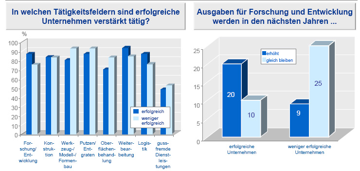 Die Unternehmen wurden anhand der recherchierten Geschäftszahlen und der Antworten im Fragebogen in erfolgreiche und weniger erfolgreiche Unternehmen differenziert. Die erfolgreichen Unternehmen beschäftigen sich stärker mit Forschung und Entwicklung, der Weiterbearbeitung ihrer Produkte und Logistik, hingegen weniger stark mit Putzen/Entgraten und Modellbau. Erfolgreiche Unternehmen versuchen, Kernkompetenzen und Alleinstellungsmerkmale zu erarbeiten. Diese Unternehmen setzen auf technologische Erfolgsfaktoren, der Preis der Produkte spieit als Differenzierungskriterium im Wettbewerb keine so große Rolle wie bei der weniger erfolgreichen Konkurrenz.