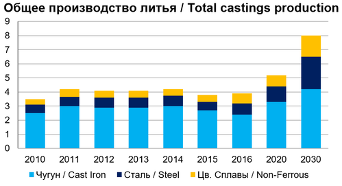 In view of many challenges Russia faces in achieving this goal, Dibrov expects about 5.2 million t to be produced in 2020 and up to 8 million t of cast p.a. in 2030, in addition to more steel and Non-Ferrous production.