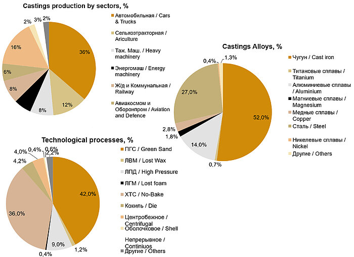 Most foundries in Russia produce for the needs of their own industry or are in-house foundries. The main customers are Automotive, Agriculture and Railway, with cast iron accounting for over 52%, Steel 27% and Aluminum 14%.