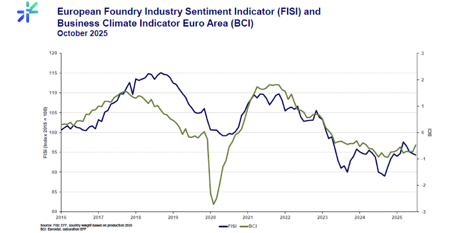 The FISI – European Foundry Industry Sentiment Indicator – is the earliest available composite indicator providing information on the European foundry industry performance. It is published by EFF — European Foundry Federation every month and is based on survey responses of the European foundry industry. The EFF members are asked to give their assessment of the current business situation in the foundry sector and their expectations for the next six months.