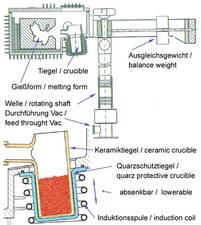 An induction coil moves from the bottom over the melting crucible (picture 6), the casting material is melted in a short time. After reaching the melting temperature the induction coil is lowered and the centrifugal casting process released.
