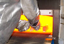 Some materials, e.g. Titanium alloys for high-tech applications, require a heat treatment directly after the casting. The casting parts are inserted into an after heat treatment furnace (picture 13) immediately after casting where they achieve pre-adjusted temperatures, holding times and exactly defined cooling down times. The furnace can be a continuous belt furnace or a chamber furnace which is operated in batch operation, e.g. a FAH and a KS-S model, respectively, from Linn High Therm.
