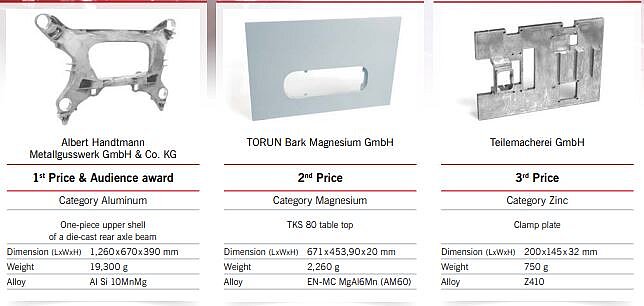 The award-winning castings show that die casting is constantly finding new applications regarding the reduction of costly production steps and saving weight.