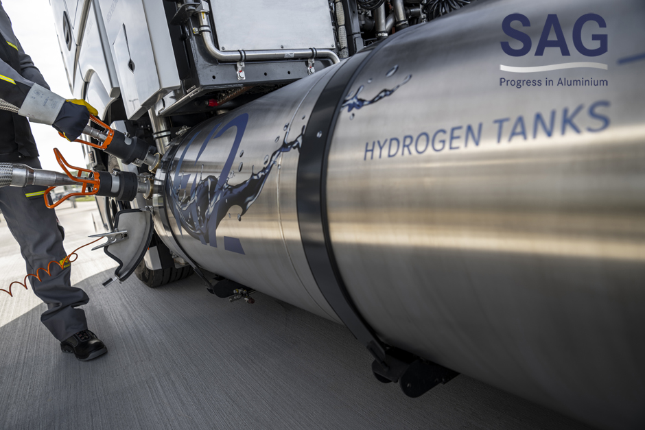 The R&D partnership in the field of cryo-tank systems for liquid hydrogen-powered trucks between Daimler Truck and the Salzburg-based Aluminium Group is entering the next phase. The first LH2 storage system for fuel cell trucks developed by Austrian engineers is undergoing intensive testing on the Daimler Truck test track. Advantages of the SAG system: compact design, large filling volume, technical reliability and long range.