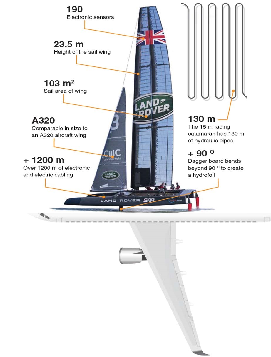 The 15 m racing catamaran has 130 m of hydraulic pipes and over 1,200 m of electronic and electric cabling connecting 190 sensors. The wing has a sail area of 103 m2 and is 23.5 m high, which is comparable to the main wings of an A320 aircraft. Each hull on R1 features a manually deployed dagger board that bends beyond 90 degrees to create a hydrofoil.