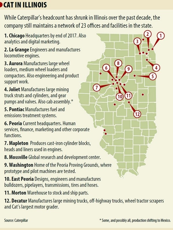 Caterpillar's top brass has never made a secret of its distaste for Illinois' business climate. Former CEO Doug Oberhelman once sent former Gov. Pat Quinn a packet of letters from other governors who had tried to persuade the mammoth manufacturer of construction and mining machinery to move. The company employs 34 percent fewer people in Illinois than in 2006, and work once performed at its plant in Joliet will eventually be done at a new factory in Monterrey, Mexico.