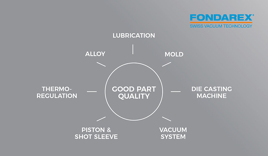 Today, vacuum technology plays a key role in the production of complex high-quality casted parts, as well as for structural components. Nevertheless, in order to guarantee an efficient vacuum process, Fondarex aims at taking into consideration the complete die casting process. The quality of the casted part will depend upon the mold tightness and precision, the alloy quality, the lubrication and thermoregulation technologies, the tightness between piston and shot sleeve, the die casting machine parameters and efficiency, as well as the adequate vacuum system (figure 1). Vacuum die casting requires complete mastery of both the pressure die casting process and the vacuum technology. Any deviation such as leakage, incorrect parameter settings, or even inappropriate dimensioning or integration of the vacuum system can have major effects on the quality of the casted part. Each project starts with the analysis of the mold. Fondarex, as the specialist in vacuum application studies, will provide recommendations on: