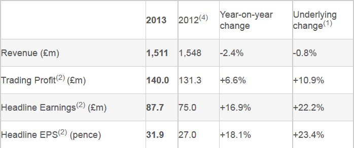 “In our first complete year as an independent company, we have successfully initiated the recovery of margins across the Group despite an unfavourable economic environment. Market conditions remained challenging in 2013, continuing from the reduced levels of activity seen in the second half of 2012, and Sterling strengthened substantially in the second half of 2013, impacting our reported growth numbers. “Against this backdrop we have taken a disciplined approach to implementing our stated strategy. We streamlined our business portfolio and activities, exiting non-core low-margin businesses, further improved the quality of our products and services, and implemented self-help measures to increase the productivity of our own businesses. “The result is improved profitability, strong cash flow, and a more focused Group. This gives us a strong platform from which to pursue our growth strategy.”