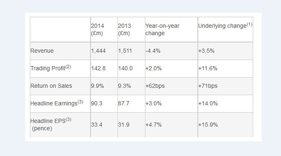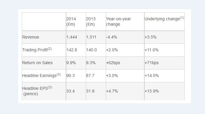 We expect the underlying trading environment in the current year to be broadly similar to that experienced in 2014. We are progressing with our plan to improve operational efficiency across the Group and these actions should drive further improvement in our trading margins during 2015.”