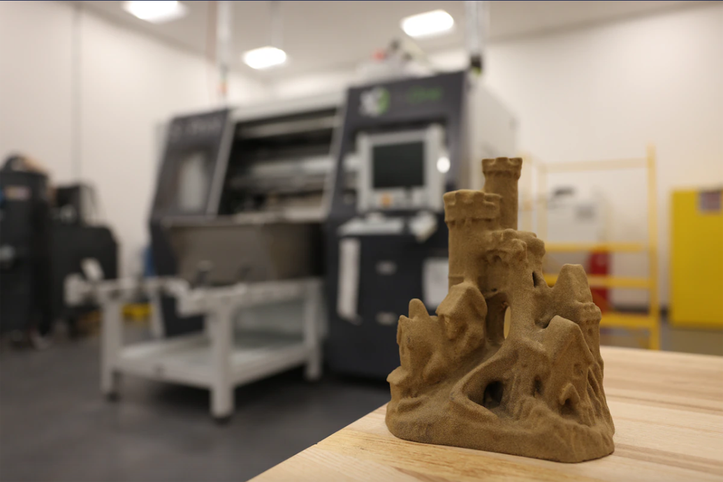 In the new foundry, parts are created by first 3D printing a mold from sand mixed with a binding agent. The mold resembles foam used by florists but denser. Aluminum ingots are melted down in the foundry, poured into the mold and allowed to cool. The casting can then be milled down to create a finished product.