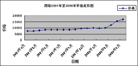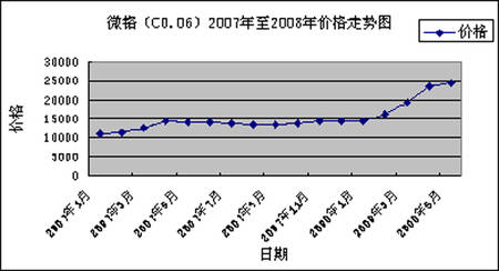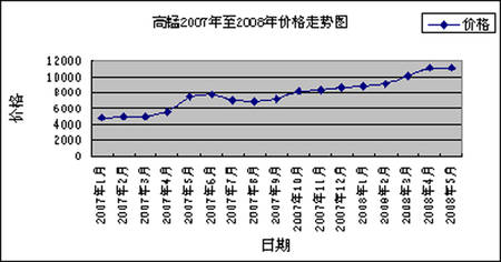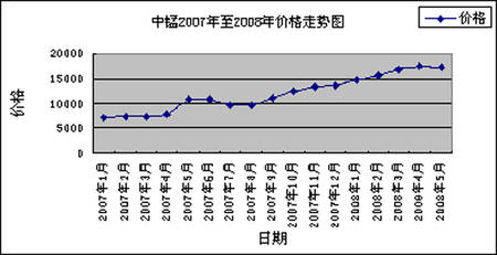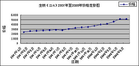 From the graph know: in Jan, 2007, the price is RMB 2,350 per ton, in Dec, 2007,the price is RMB3,694 per ton, which up by 57%. On 31th, May, 2008, the price had came to RMB5000 per ton or so. From the Jan,2008 to now, the price have up by 35%. Compare to Jan,2007, it have up by 113%.