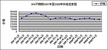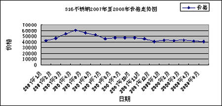 It is well know that nickel and chromium are the main raw materials of the stainless steel. The chromium price was steady in 2007 in the international market, so the nickel price can directly reflect the stainless steel markets. The nickel price experienced a drastic change in 2007. In May it was rise to the peak which broke the record, since then the nickel prices gradually come down. The stainless steel experienced a drastic change with the price change of the nickel too. From the graph 14 show the stainless steel 304 (exclude taxes): the prices between RMB27000-36000 per ton from Jan. to March, and up to RMB37,275 per ton from March to June, then dropped to RMB24,420 per ton. Stainless steel 316 (exclude taxes) prices are 4-5 million in the whole year and the highest price up to RMB52,500 per ton. So we estimate the price of stainless steel will be Stable and it would be rise while the chromium price rise.