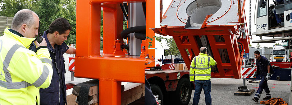 Pünktlich zu Monatsbeginn ist der Aufbau der „Bright World of Metals“ in Düsseldorf gestartet. Die ersten Schwertransporte rollen an und stellen die Düsseldorfer Messe-Logistiker vor harte Aufgaben und Arbeit. Eines der ersten Exponate war am vergangenen Freitag ein 50 Tonnen schwerer und über fünf Meter hoher Induktionsofen des Dortmunder Ofenbauers ABP Induction. Mit Hilfe von drei Kränen musste das Schwergewicht aus der liegenden Position stehend auf einen Tieflader aufgeladen werden. Für Kay Lohe vom Logistikunternehmen Kuehne + Nagel keine unlösbare Aufgabe, aber eine echte Herausforderung: „Im Ab- und Beladen sind wir natürlich Profis, dennoch fordern uns Exponate in diesen Dimensionen immer wieder besonders heraus. Zudem ist das Rangieren hinter den Messehallen durch die umfangreichen Baumaßnahmen dort, nicht einfacher geworden.“ So musste zum Beispiel ein Baugerüst für die Einfahrt des Tiefladers in die Messehalle 10 abgebaut und anschließend wieder aufgebaut werden. Vier Stunden dauerte am Freitag allein der Transport des Ofens in die Halle, das Aufstellen dort war anschließend nahezu ein Kinderspiel für die Logistik-Profis. Hier wird er zur GIFA, METEC, THERMPROCESS und NEWCAST vom 16. bis 20. Juni dem internationalen Publikum vorgestellt und anschließend nach Rabigh in Saudi Arabien verschifft. Dort wird er als Teil eines Werkes zur Herstellung von Baustahl rund 35 Tonnen Stahl in 40 Minuten liefern können.