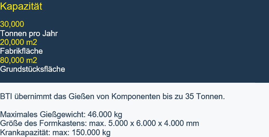 Die Gießerei wird von Beginn an in der Lage sein, Teile bis zu 35 Tonnen zu fertigen. Derzeit wird geprüft, wie die Kapazitäten in späteren Phasen erweitert werden können, um den Markt bestmöglich zu bedienen. Die jährliche Produktionskapazität von Baettr Chennai soll im Jahr 2025 bei 50.000 Tonnen liegen.